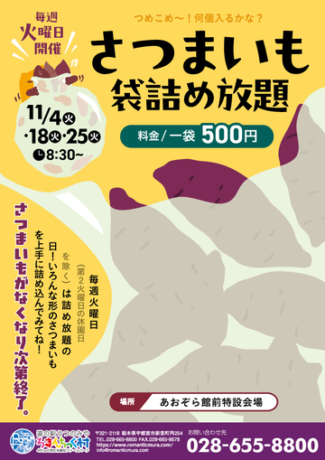 毎週火曜日(休園日を除く)は、あおぞら館詰め放題の日!🍠