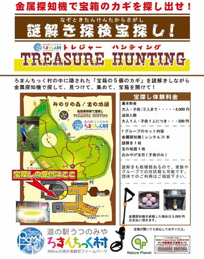ろまんちっく村に散りばめられた「5つの謎」を解いて金属探知機で宝箱のカギを探し、