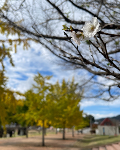 にぎわい広場周辺の銀杏が色づく中、なんと桜が咲き始めました!