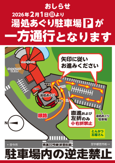 🚗湯処あぐり駐車場 一方通行のお知らせ 2/1~