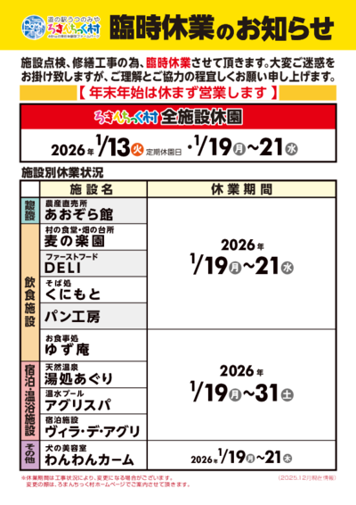 施設点検の為、引き続き1月31日(土)まで臨時休業となります。