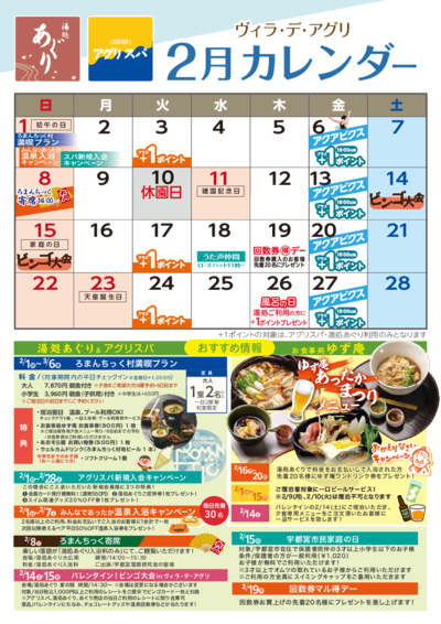 2月1日営業再開!【ヴィラ・デ・アグリ】2月お得な情報カレンダー